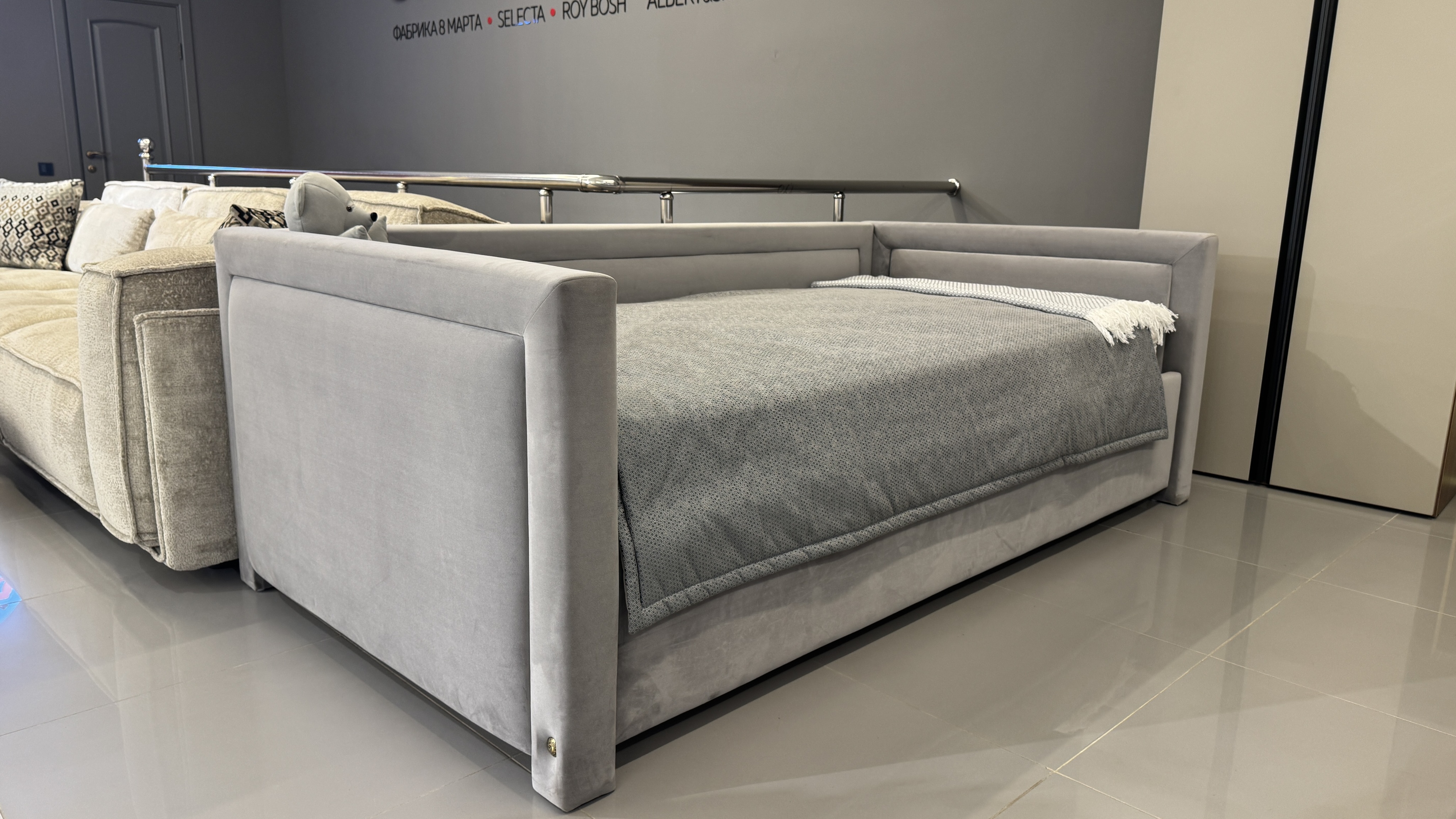 Односпальная кровать «Йорк» — практичная софа в американском стиле для гостиных, детских комнат и гостевых спален. Кровать с прямоугольной спинкой и прямыми локотниками, украшенными декоративными гвоздиками по периметру корпуса, гармонично впишется в любой интерьер. Выберите подходящее оформление — однотонный бархат или велюр, ткань в клетку, материал с цветочным или графическим принтом.