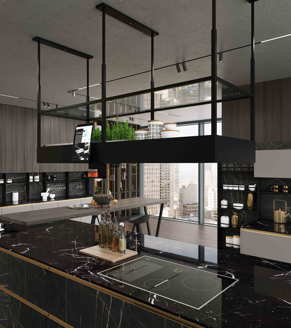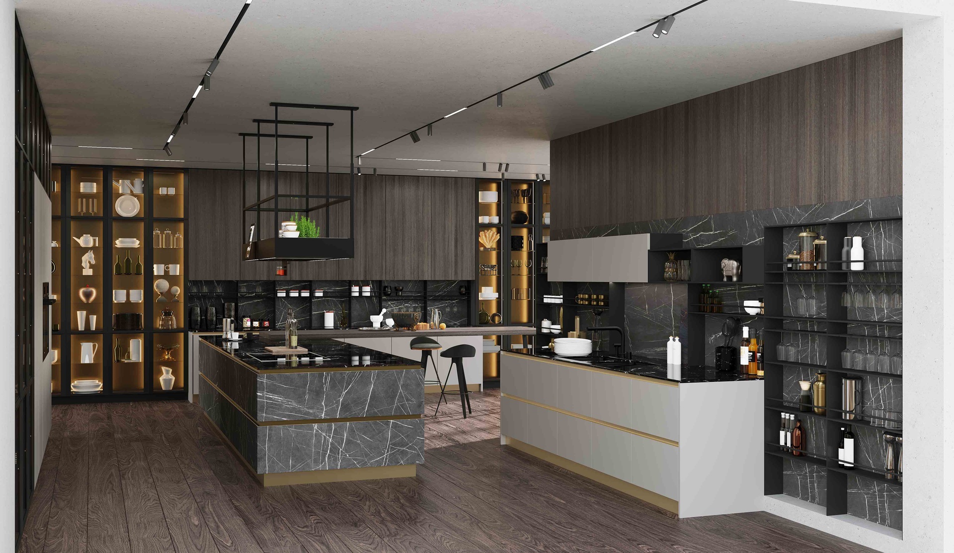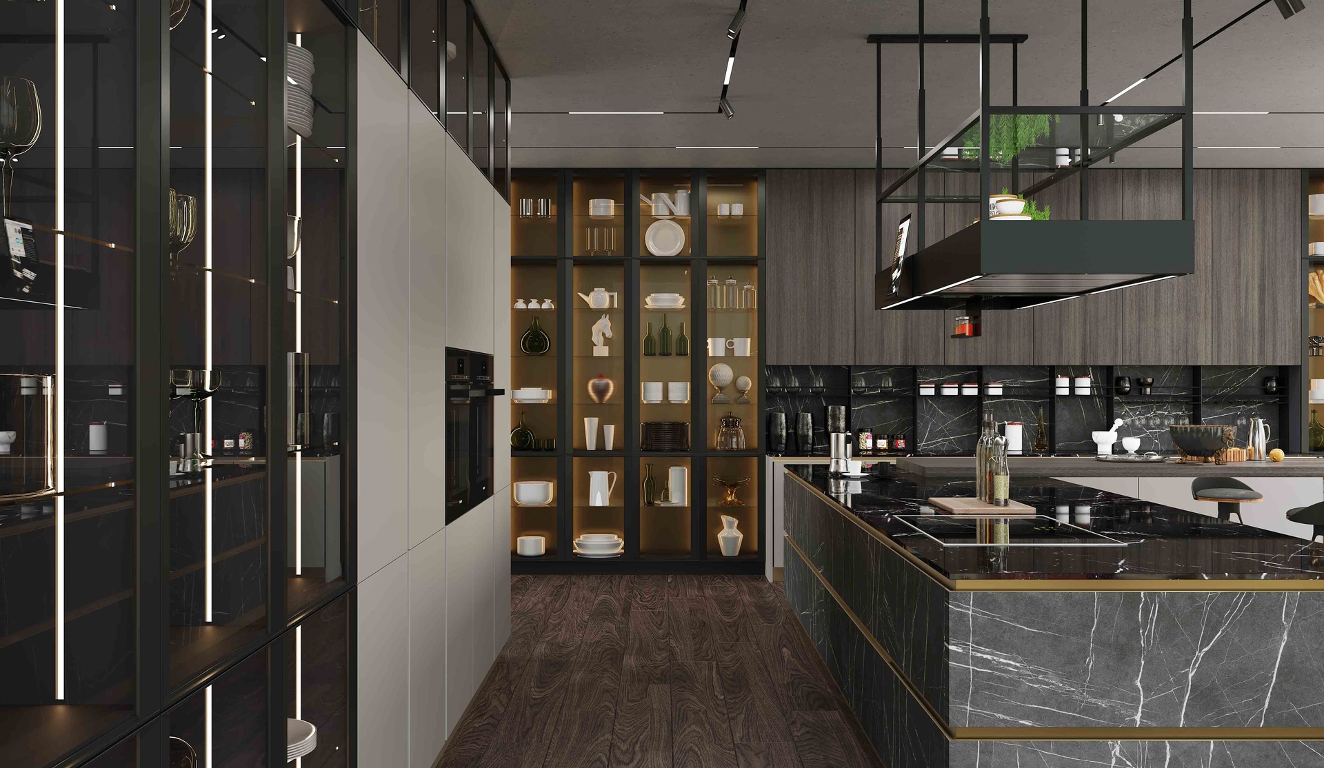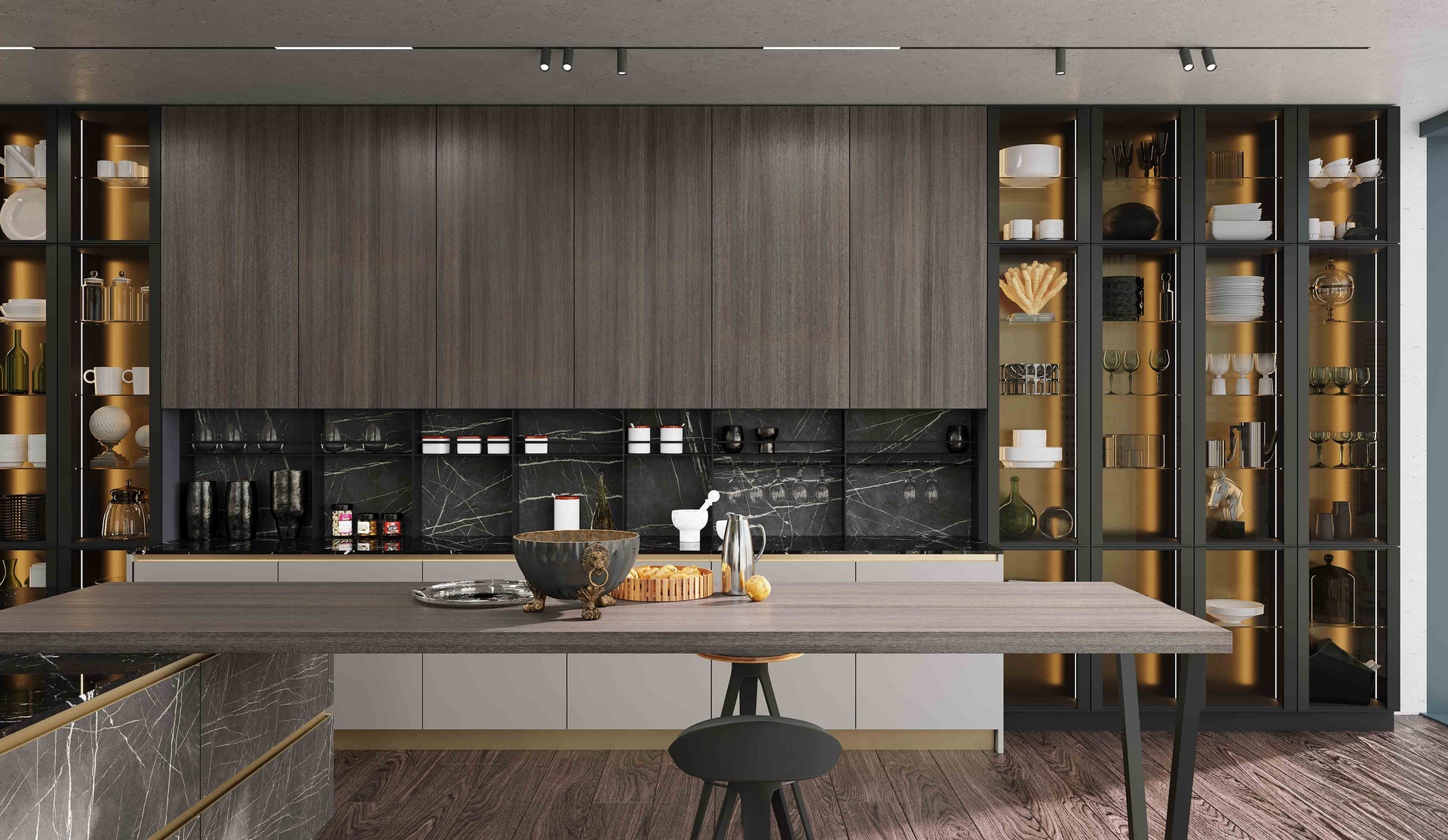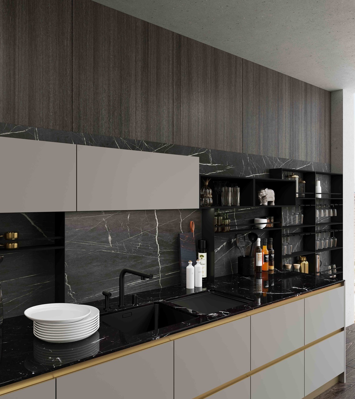 Феррата – современная кухня, в которой детали выходят на первый план и играют важную роль. Интегрированная система GOLA золотого цвета выступает ярким акцентом в кухне и добавляет интерьеру неповторимый дизайн. Открытые брутальные элементы черного цвета наряду с элегантными золотым профилем и цоколем придают модели индустриальный и технический минимализм с нотами шика и позволяют увеличить пространство для хранения. Богатая гамма отделок, трендовые материалы, интересные тактильные ощущения создают эффектный и современный интерьер с гостеприимной атмосферой.