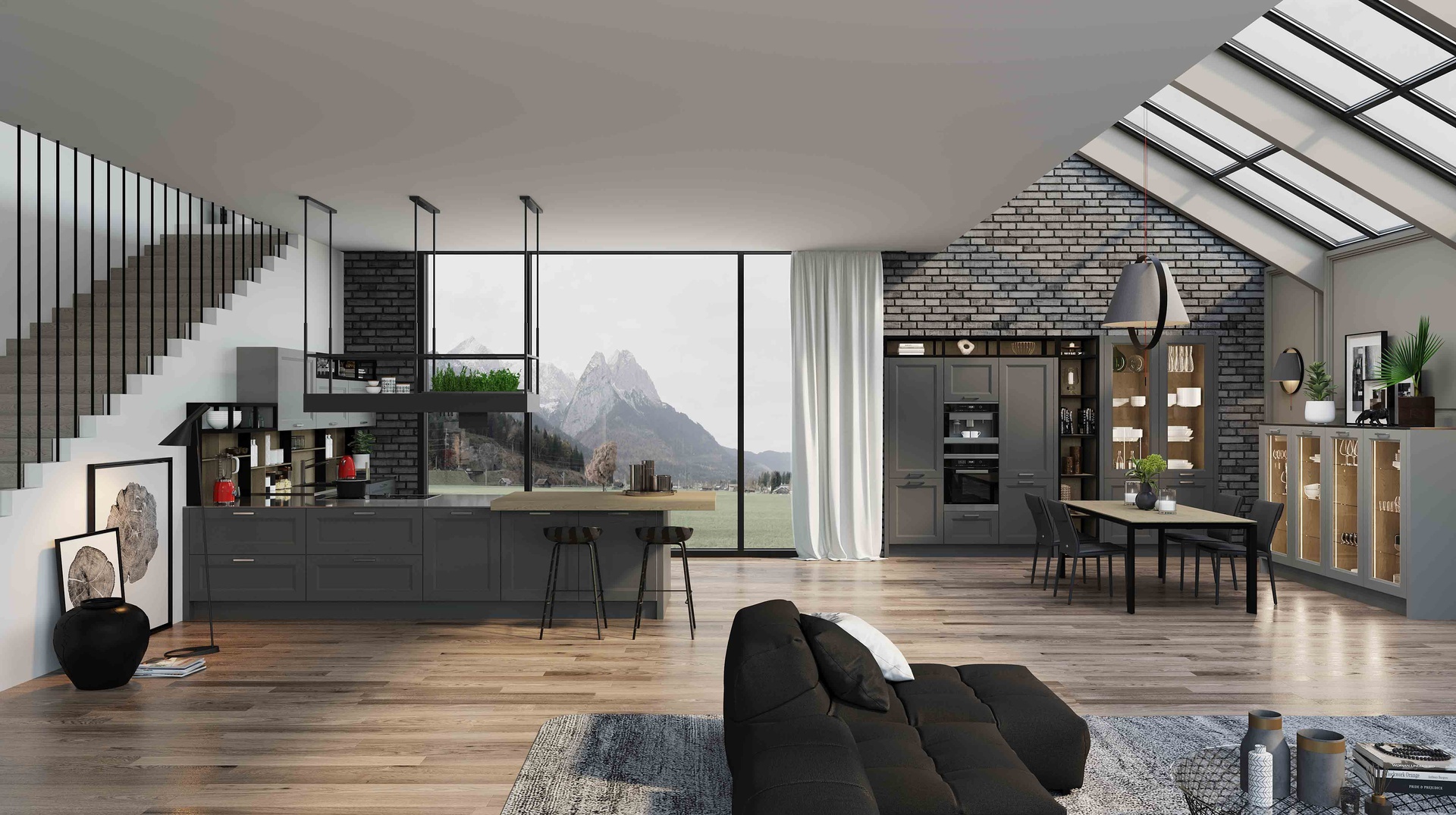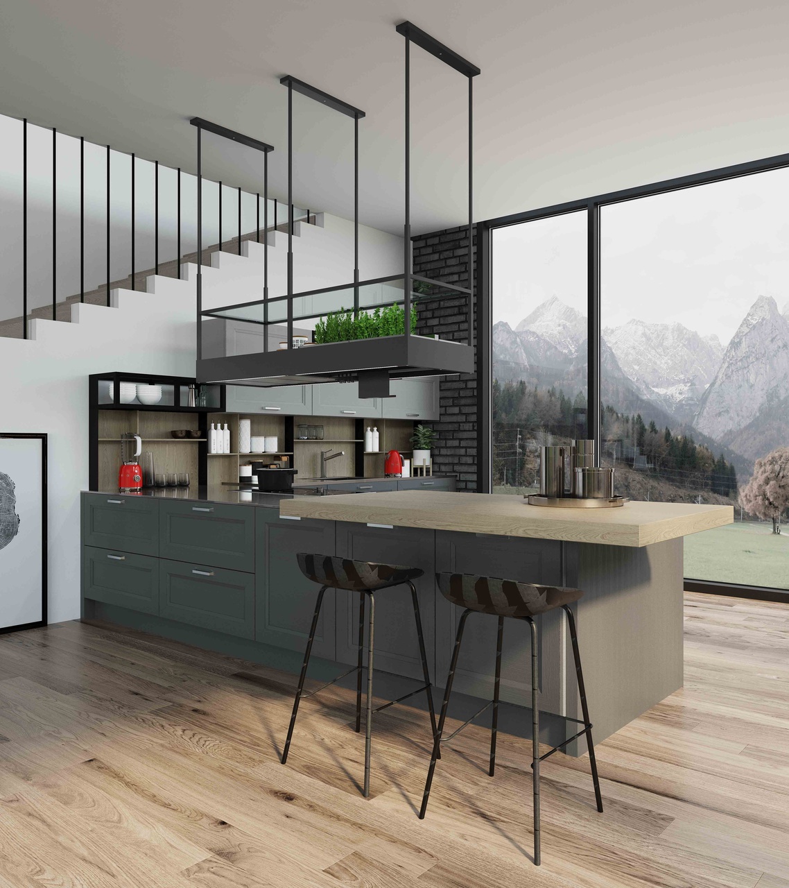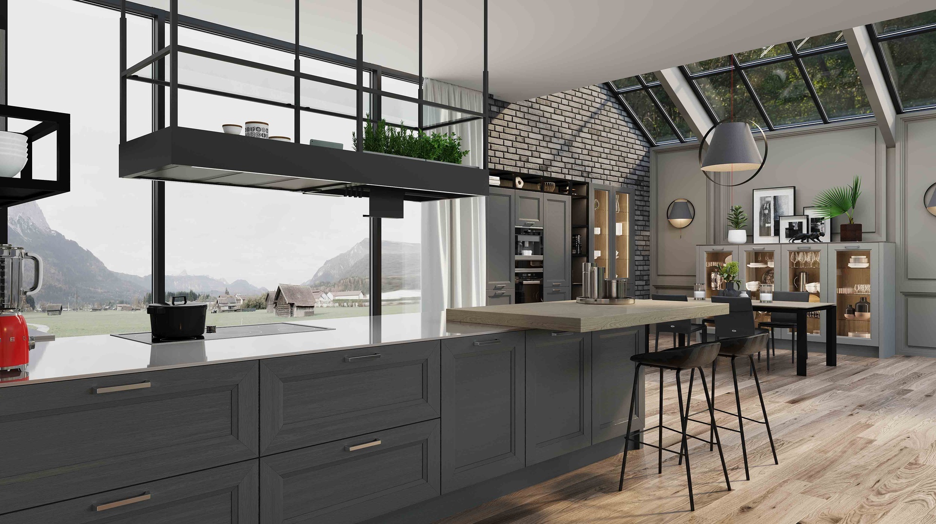 Широкая рамка фасада модели идеально контрастирует с элегантными тонкими металлическими стеллажами ОДЕРЦО и ШЕЙД. А древесные задние стенки и корпуса подчеркивают интерьер загородного стиля.