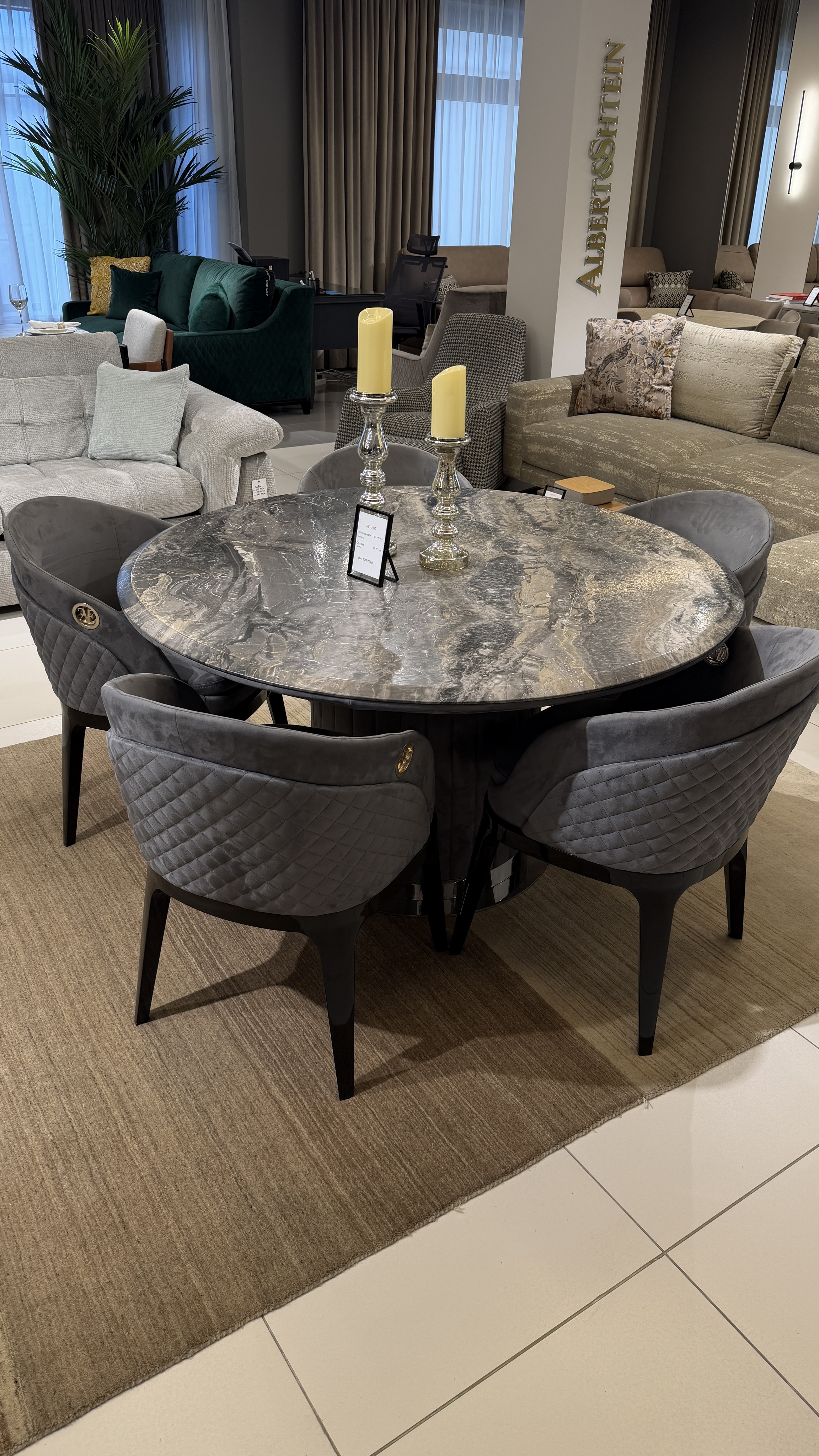 Столешница доступна в двух вариантах: натуральный камень с неповторимым рисунком или кварцевый агломерат, сочетающий красоту и износостойкость. Основание украшено металлической накладкой на выбор –  золото, серебро или  черный матовый