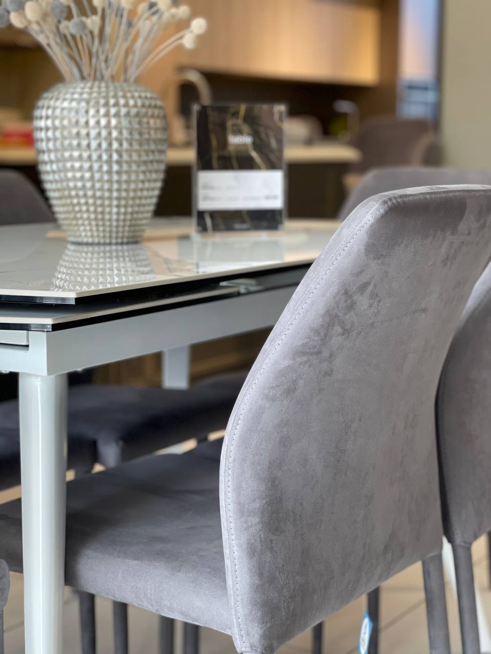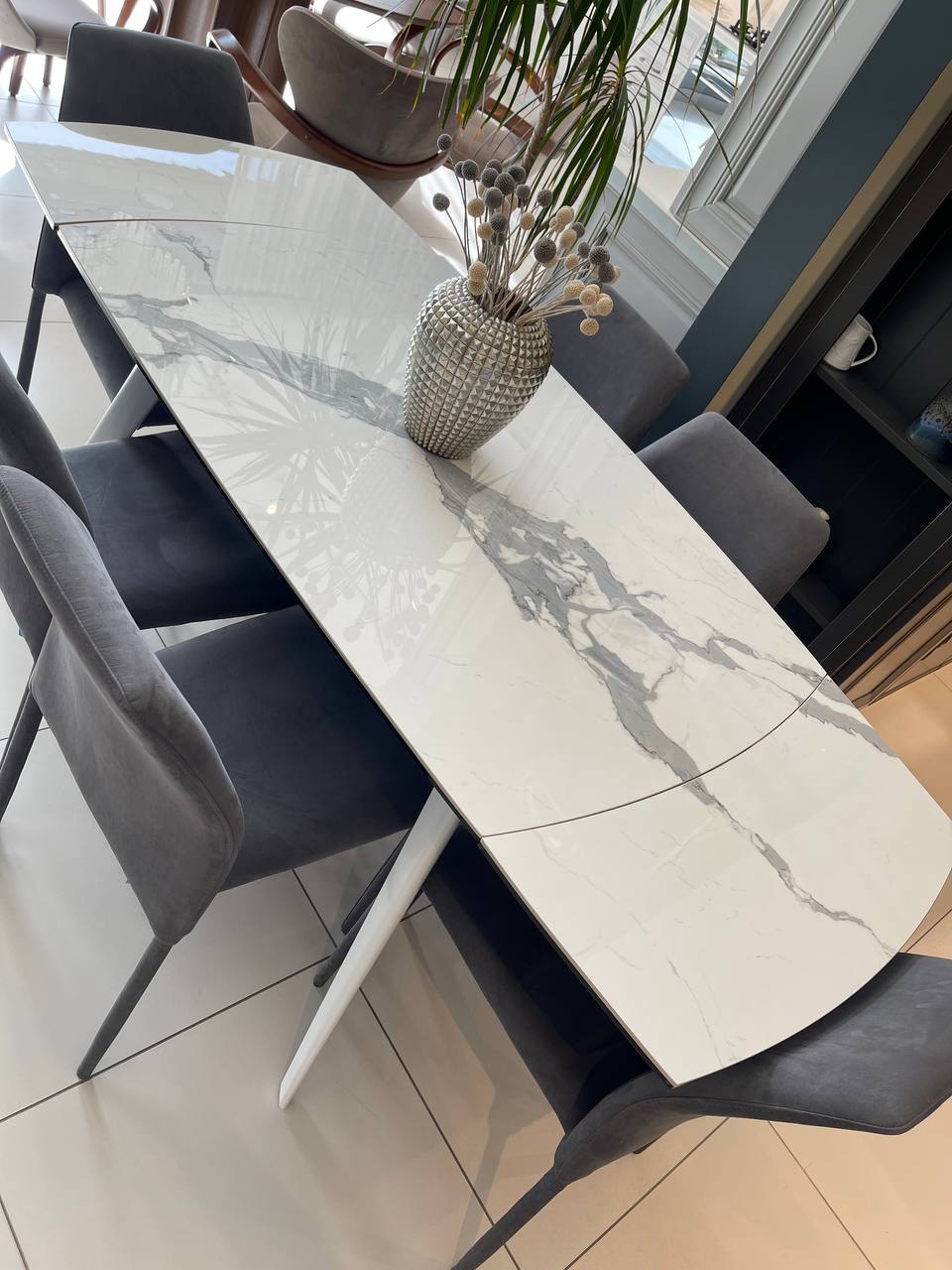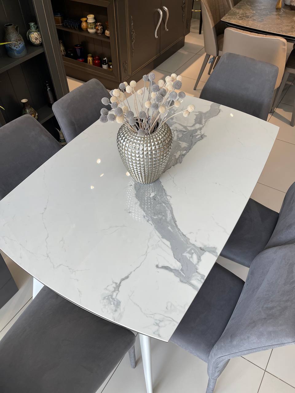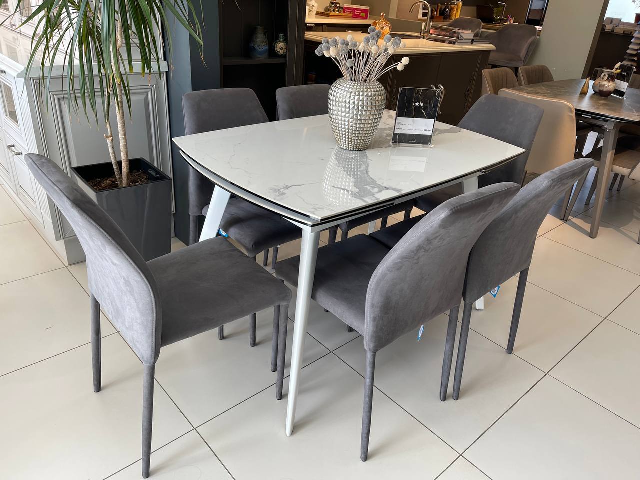Все обеденные группы коллекции Aurora - идеальны для современных кухонь или обеденных зон. Каждая из моделей коллекции отличается не только своим дизайном и размерами, а также керамикой, используемой в столешницах. В основу создания этой модели, легли максимальная компактность и функциональность. В сложенном виде столешница не превышает 120 см, а независимые всплывающие вставки увеличивают ее размер на 30 или 60 см. При использовании двух вставок, размер стола достигает 180 см. Эта модель столовой представлена нашими дизайнерами в керамике Bianco Scultoreo Lucido.