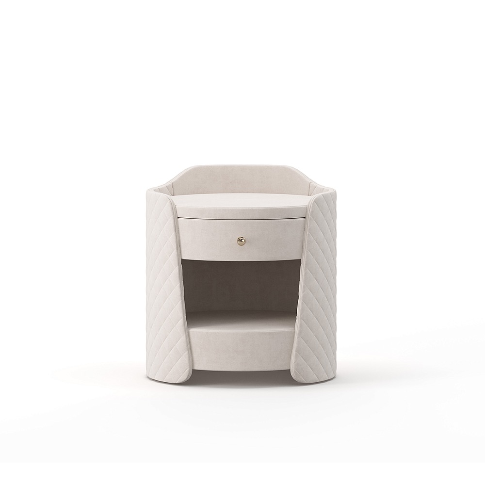 Декоративные элементы тумбы Палладиум: стеганный каркас по внешней стороне, зеркало в качестве столешницы, яркий аксессуар на выдвижном ящике – металлизированная ручка.